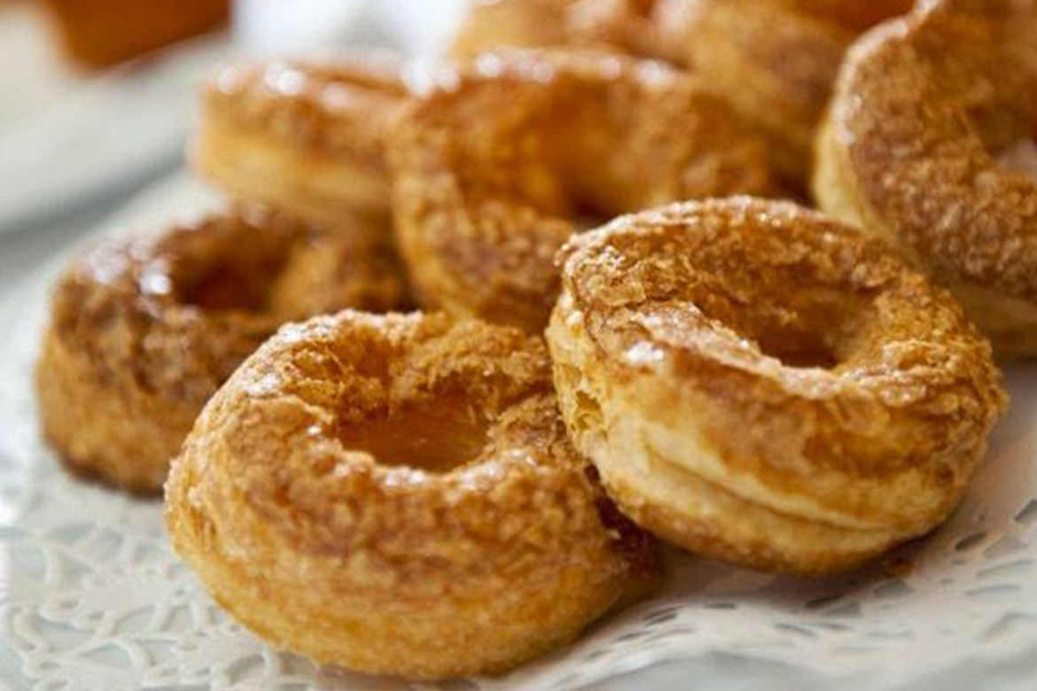 Lavorate bene la pasta, fatela riposare per una decina di minuti in frigo e poi stendetela un po’ spessa. Mettete al centro il rimanente burro e sollevate verso l'alto i quattro angoli della sfoglia in modo da racchiuderlo bene. Lasciare raffreddare e poi stendere di nuovo l’impasto formando uno strato sottile. Ripetete per quattro volte ancora questa operazione. Tagliate a strisce e unitele tra loro formando delle ciambelline, passate delicatamente con il mattarello, mettete in una teglia e infornate. Il tocco in più? Pennellarle con zucchero sciolto in acqua e albume d'uovo.
