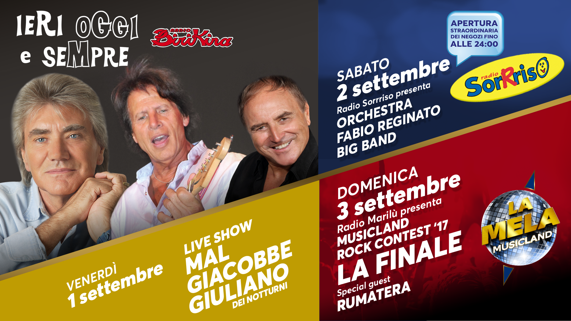 Cominciamo con Mal, Sandro Giacobbe e Giuliano dei Notturni, che saranno nostri ospiti questo venerdì, durante la serata con Radio Birikina. Assieme a loro, anche i Defenders e i Giovani di Festival show saliranno sul palco per intrattenerci con la loro musica! Sabato in Orchestra con Fabio Reginato Big Band, e negozi aperti fino alle 24, per concludere in bellezza con la finale del Rock Contest 2017: special guest i Rumatera!