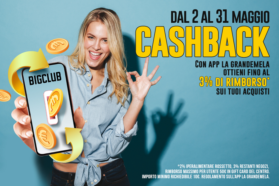 Con l’app La GrandeMela entri nel mondo del Cashback: ottieni fino al 3% di rimborso sui tuoi acquisti nei negozi del Centro!